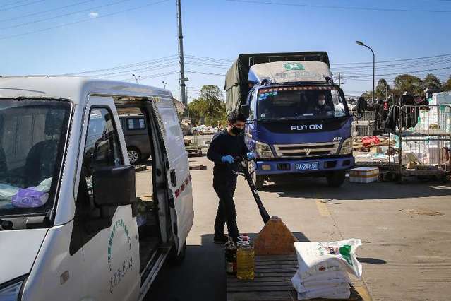 2月16日,湖北省武漢市,送菜小哥許可在裝載貨物。中青報(bào)·中青網(wǎng)記者 趙迪攝