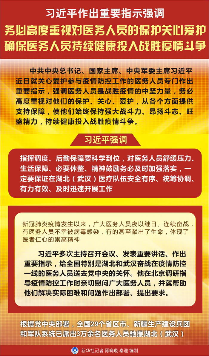 新冠肺炎疫情發(fā)生以來,廣大醫(yī)務(wù)人員夜以繼日、連續(xù)奮戰(zhàn),有醫(yī)務(wù)人員不幸被病毒感染,有的甚至獻(xiàn)出了生命,體現(xiàn)了醫(yī)者仁心的崇高精神。習(xí)近平多次主持召開會(huì)議、發(fā)表重要講話、作出重要指示,給全國特別是湖北和武漢奮戰(zhàn)在疫情防控一線的醫(yī)務(wù)人員送去黨中央的關(guān)懷。他在北京調(diào)研指導(dǎo)疫情防控工作時(shí)親切慰問廣大醫(yī)務(wù)人員,并就幫助他們解決實(shí)際困難和問題作出部署、提出要求。