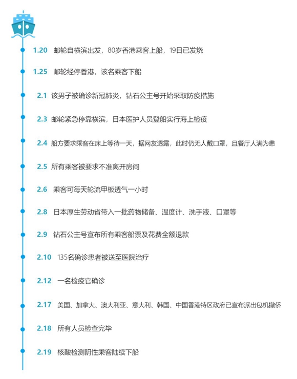第一例確診病例為香港80歲男性,20日登船后開始發(fā)燒,25日下船,2月1日確診,而郵輪自2月5日開始才實(shí)施隔離措施,停止餐廳及公共場所對外運(yùn)營。