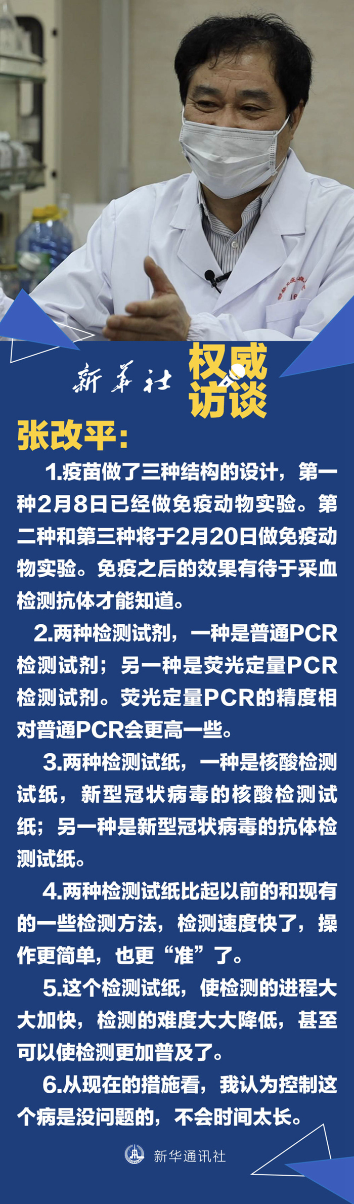 張改平:從武漢發(fā)生了新冠病毒的感染之后,我們一直高度重視。隨著這個疫情的進(jìn)展,我們覺得應(yīng)該干點什么,因為我們擁有這么多的實驗室,有這么好的條件,有這么大的團(tuán)隊,因此我們就決定做一些檢測試劑和疫苗,因為檢測試劑和疫苗是病毒性疾病感染的防控中,很重要的技術(shù)支撐和技術(shù)手段。