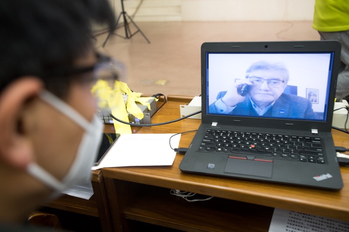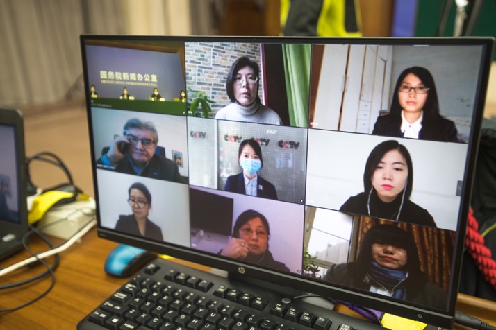 記者通過(guò)視頻連線提問(wèn)。新華社記者肖藝九攝。