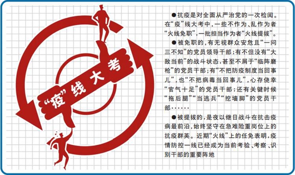 疾風知勁草,烈火見真金。疫情還是檢驗黨性的試金石,歷練擔當?shù)哪サ妒孀R作風的照妖鏡,管窺初心的望遠鏡。一批敢挑重擔、沖鋒在前的英雄脫穎而出;一批作風漂浮、失職失責的干部“火線免職”。