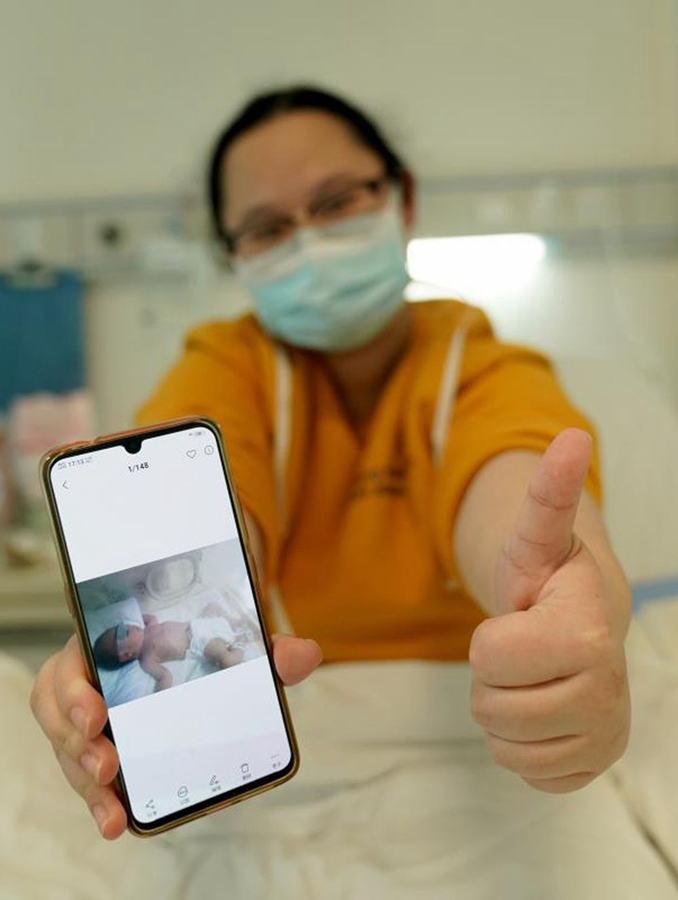 2月18日,楊女士展示手機(jī)中自己兒子的照片。在武漢華中科技大學(xué)同濟(jì)醫(yī)院中法新城院區(qū)新冠肺炎重癥病區(qū)住院的楊女士是武漢人,在身患新冠肺炎后剖腹產(chǎn)下一名男嬰。嬰兒目前在醫(yī)院進(jìn)行隔離觀察,但各項(xiàng)指標(biāo)均正常。當(dāng)楊女士知道孩子的情況后,懸著的心終于放下。在醫(yī)護(hù)人員的努力下,她的病情也有了好轉(zhuǎn)。新華社記者王毓國 攝