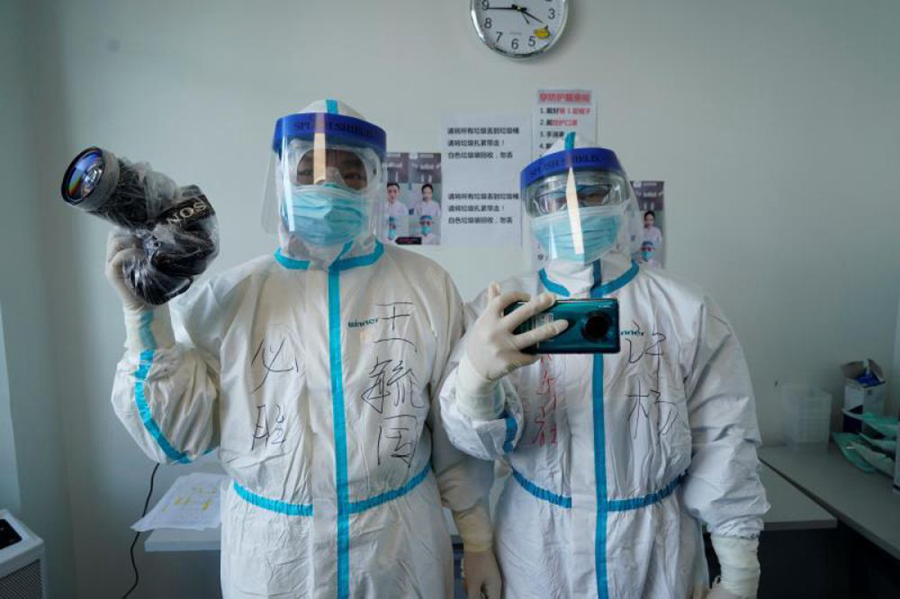 2月18日,新華社記者王毓國(左)、許楊在華中科技大學(xué)同濟(jì)醫(yī)院中法新城院區(qū)準(zhǔn)備進(jìn)入隔離病房內(nèi)采訪。新華社記者 余國慶 攝