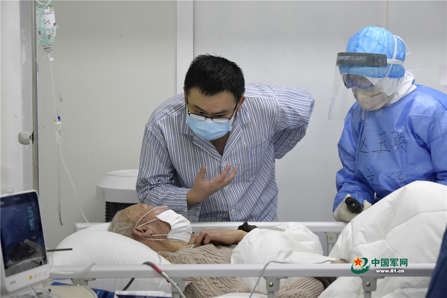 在病房,萬先生當“翻譯”,幫助醫(yī)護人員和只會講方言的老年患者交流。中國軍網記者范顯海 攝