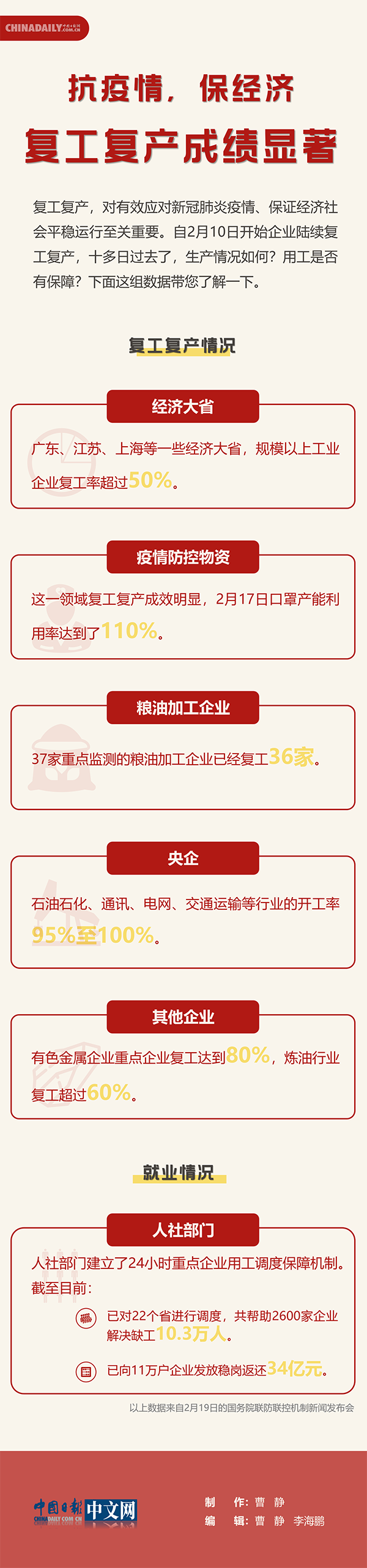 復(fù)工復(fù)產(chǎn),對(duì)有效應(yīng)對(duì)新冠肺炎疫情、保證經(jīng)濟(jì)社會(huì)平穩(wěn)運(yùn)行至關(guān)重要。自2月10日開(kāi)始企業(yè)陸續(xù)復(fù)工復(fù)產(chǎn),十多日過(guò)去了,生產(chǎn)情況如何?用工是否有保障?下面這組數(shù)據(jù)帶您了解一下。