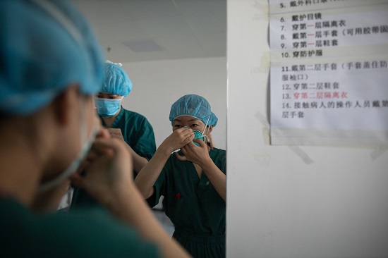 2月20日,高峰值班。他得到通知,當(dāng)天有兩例病人需要插管。經(jīng)過與主治醫(yī)師溝通,決定在上午進行。“敢死隊”護士先在病房內(nèi)準備工具、藥品,然后通知高峰準備。