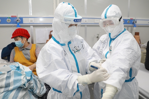 雷神山醫(yī)院內(nèi)患者告訴護(hù)士飲食禁忌,由于沒有紙護(hù)士就記錄在衣服上
