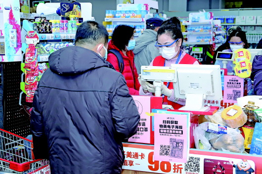 春節(jié)以來,超市客流量增加,物美超市北京石景山區(qū)太陽島門店收銀員葉宗萍一直在門店堅(jiān)守,從春節(jié)至今沒歇一天。采訪對象供圖