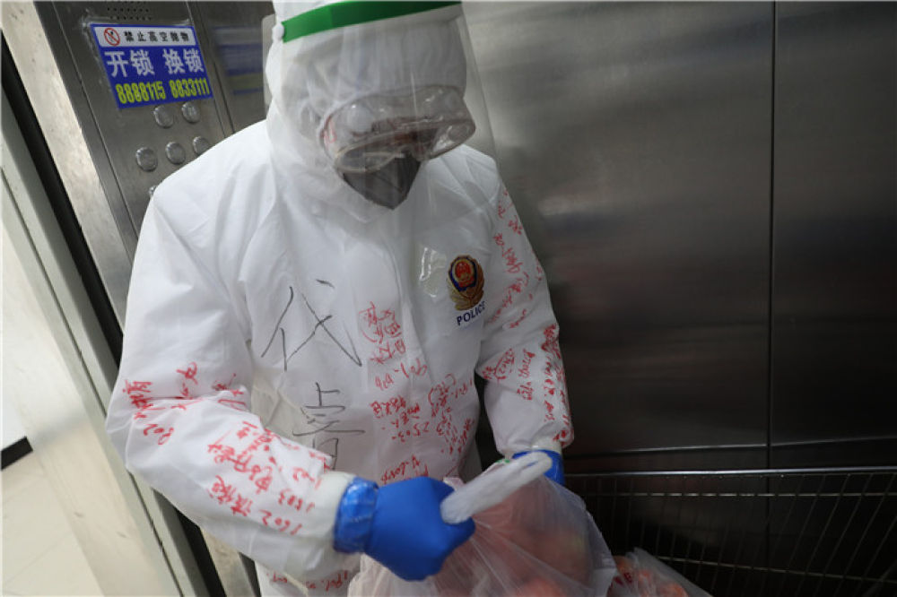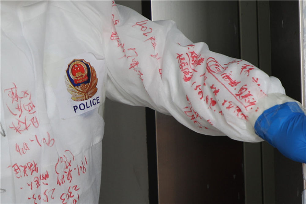 用紅色簽字筆寫在防護(hù)服上醒目的位置