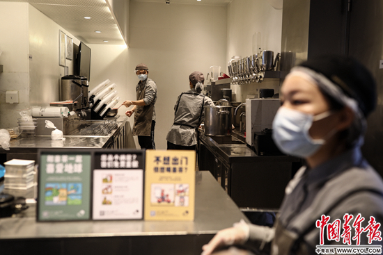 喜茶漢街LAB店和大多數(shù)店鋪一樣暫停營業(yè)了。2月22日,中青報·中青網(wǎng)記者實地探訪時發(fā)現(xiàn),空空蕩蕩的店鋪里擺著一排排裝滿食物的紙袋,10名工作人員戴著口罩,如往常一樣在忙碌地制作奶茶和面包。
