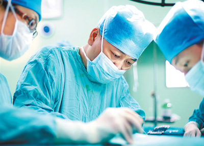 手術臺上的江學慶(中)。 武漢市中心醫(yī)院供圖