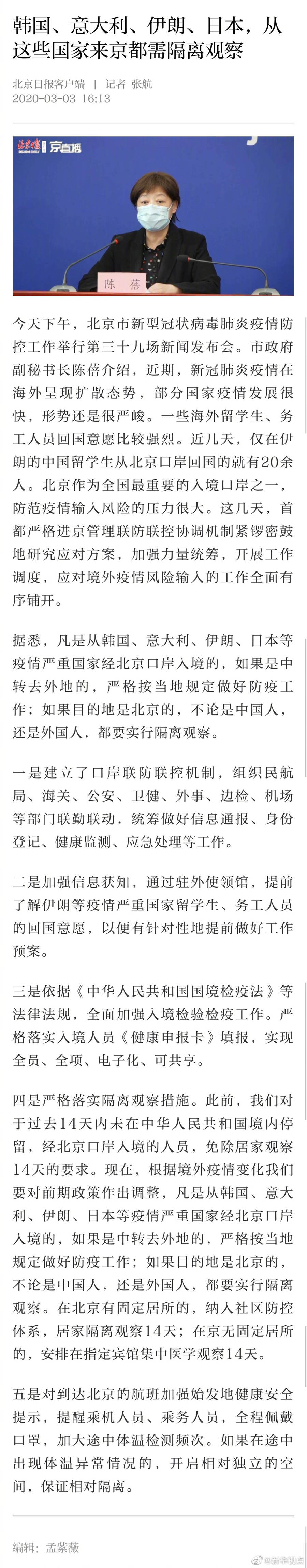 今天下午,北京市新型冠狀病毒肺炎疫情防控工作舉行第三十九場新聞發(fā)布會。市政府副秘書長陳蓓介紹,凡是從韓國、意大利、伊朗、日本等疫情嚴重國家經(jīng)北京口岸入境的,如果是中轉去外地的,嚴格按當?shù)匾?guī)定做好防疫工作;如果目的地是北京的,不論是中國人,還是外國人,都要實行隔離觀察。