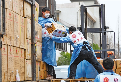 3月3日,武漢市青山區(qū)武糧倉庫,志愿者在搬運(yùn)捐贈的水果等物資。記者 高興貴攝
