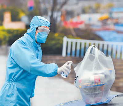 重慶部分火鍋企業(yè)在重慶市商務(wù)委和相關(guān)部門的指導(dǎo)下,為消費(fèi)者提供零接觸火鍋外賣服務(wù)。圖為重慶一家火鍋店的配送人員在消費(fèi)者來取外賣之前對(duì)包裝袋進(jìn)行消毒。新華社記者 王全超攝