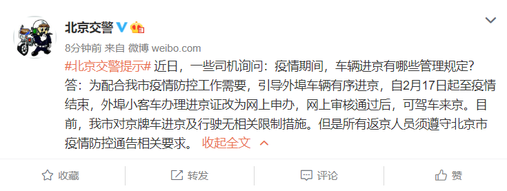 據(jù)北京市公安局公安交通管理局官方微博3月4日消息,近日,一些司機(jī)詢(xún)問(wèn):疫情期間,車(chē)輛進(jìn)京有哪些管理規(guī)定?答:為配合我市疫情防控工作需要,引導(dǎo)外埠車(chē)輛有序進(jìn)京,自2月17日起至疫情結(jié)束,外埠小客車(chē)辦理進(jìn)京證改為網(wǎng)上申辦,網(wǎng)上審核通過(guò)后,可駕車(chē)來(lái)京。目前,我市對(duì)京牌車(chē)進(jìn)京及行駛無(wú)相關(guān)限制措施。但是所有返京人員須遵守北京市疫情防控通告相關(guān)要求。