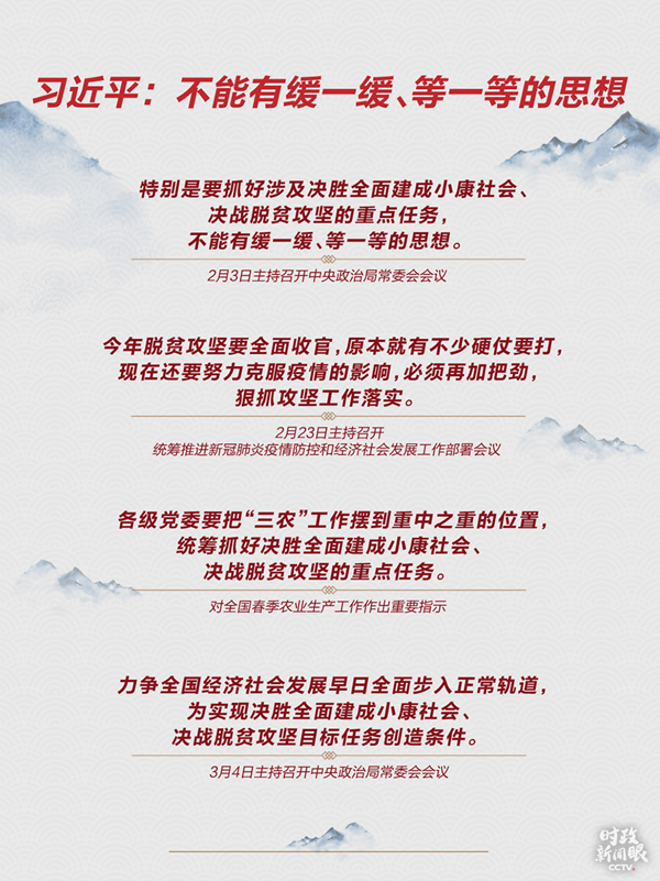 去年3月7日,習近平在甘肅代表團專門談脫貧攻堅,“不獲全勝、決不收兵!”今年3月6日,距離收官已不足10個月,決戰(zhàn)決勝脫貧攻堅座談會在北京召開。習近平在會上說,“到2020年現(xiàn)行標準下的農(nóng)村貧困人口全部脫貧,是黨中央向全國人民作出的鄭重承諾,必須如期實現(xiàn),沒有任何退路和彈性”。