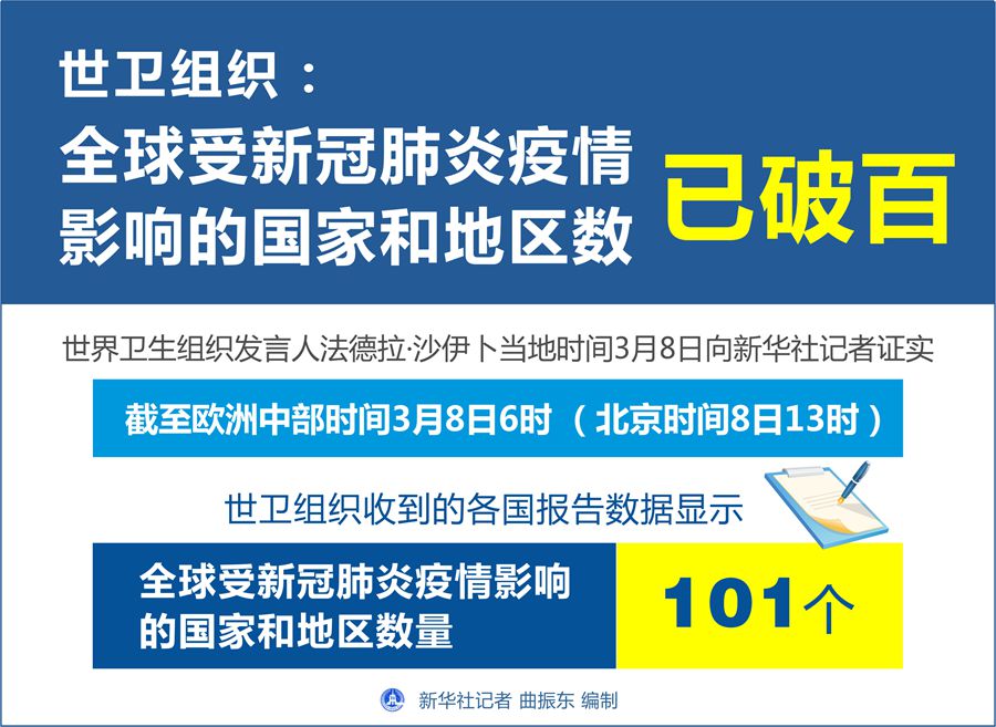新華社日內瓦3月8日電(記者劉曲 陳俊俠 沈忠浩)世界衛(wèi)生組織發(fā)言人法德拉·沙伊卜8日向新華社記者證實,截至歐洲中部時間8日6時(北京時間8日13時),世衛(wèi)組織收到的各國報告數(shù)據(jù)顯示,全球受新冠肺炎疫情影響的國家和地區(qū)數(shù)量已達101個。