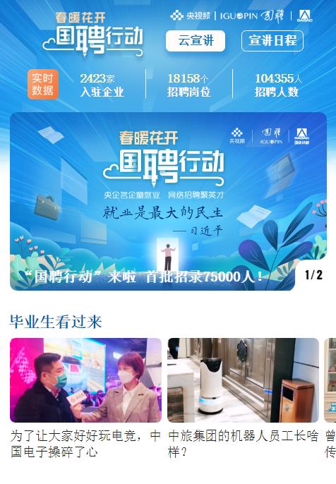 由中央廣播電視總臺“央視頻”攜手國投集團(tuán),與國務(wù)院國資委共同推出的大型線上招聘活動——“春暖花開 國聘行動”自3月2日啟動以來,企業(yè)踴躍參與,求職者紛紛投遞簡歷、尋找機(jī)遇。截至目前,中央企業(yè)和知名民企先后舉辦了18場網(wǎng)絡(luò)招聘“云宣講”,面向社會提供了超10萬個(gè)招聘職位,累計(jì)入駐企業(yè)近2500家。