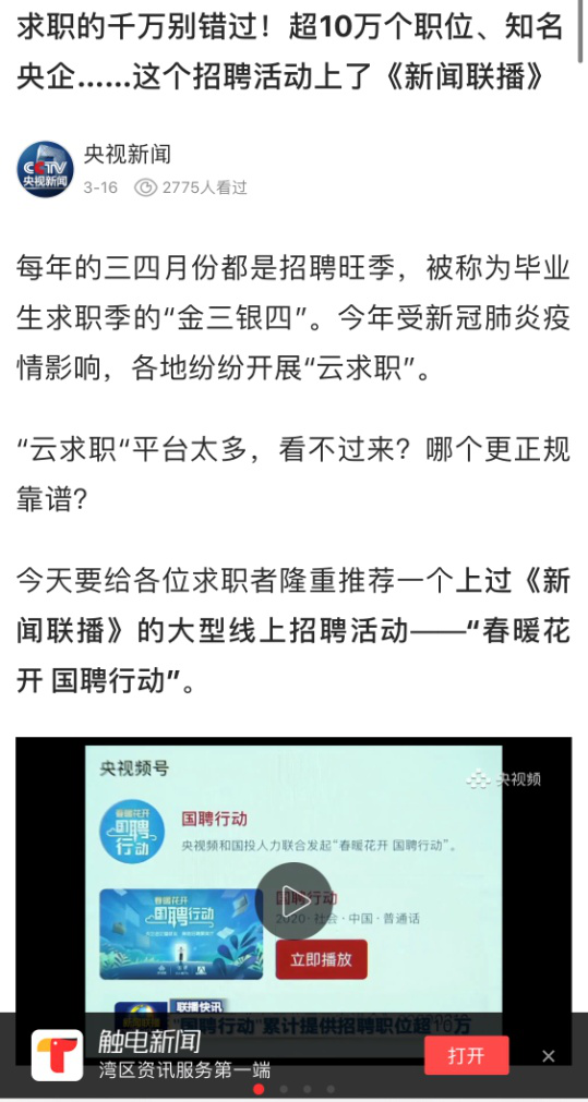 由中央廣播電視總臺“央視頻”攜手國投集團,與國務院國資委共同推出的大型線上招聘活動——“春暖花開 國聘行動”,自3月2日啟動以來,企業(yè)踴躍參與,求職者紛紛投遞簡歷。截至3月14日已面向社會提供了超10萬個招聘職位,累計入駐企業(yè)近2500家,引發(fā)眾多媒體和網(wǎng)站轉載報道。