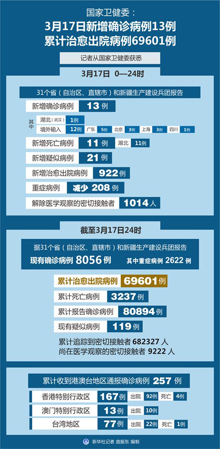 截至3月17日24時(shí),據(jù)31個(gè)?。ㄗ灾螀^(qū)、直轄市)和新疆生產(chǎn)建設(shè)兵團(tuán)報(bào)告,現(xiàn)有確診病例8056例(其中重癥病例2622例),累計(jì)治愈出院病例69601例,累計(jì)死亡病例3237例,累計(jì)報(bào)告確診病例80894例,現(xiàn)有疑似病例119例。累計(jì)追蹤到密切接觸者682327人,尚在醫(yī)學(xué)觀察的密切接觸者9222人。