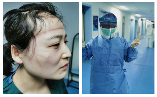 第一次下班后看到臉上被勒出來了深深的痕印,第一次從紅區(qū)出來的時候止不住想要嘔吐,摸著臉上的“溝壑”,我偷偷地流了淚,當(dāng)時心想:我這是要毀容了嗎?可是我還沒有男朋友呢……