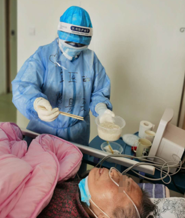 我所在的湖北婦幼保健院光谷院區(qū)感染二科是重癥科室,病人基本都是生活不能自理的老奶奶、老爺爺。除了日常的護理工作---輸液、動靜脈采血、插胃管、導(dǎo)尿管、檢測呼吸機、搶救病人、病房的洗消、垃圾的處理外,還要喂飯、喂藥,換尿不濕。因為語言不通(老人家說武漢方言),還要連說帶比劃,半天才能搞明白爺爺奶奶們想要表達的意思。一個班下來,渾身都是汗快要累癱了,但是耳邊老爺爺老奶奶的話語,“孩子,謝謝你”,那時候我的心里倍感欣慰,感覺渾身都是勁。