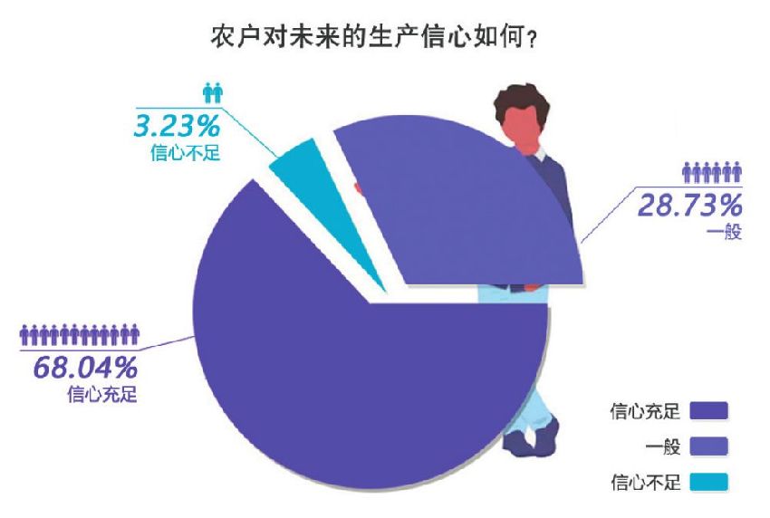 問卷調查顯示,68.04%的農(nóng)戶表示對糧食生產(chǎn)未來“信心充足”,28.73%的農(nóng)戶表示“信心一般”,信心不足的僅占3.23%。(見圖2)