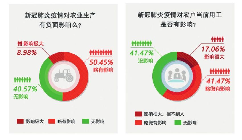557份有效問卷數(shù)據(jù)顯示,8.98%的農(nóng)戶認為疫情對農(nóng)業(yè)生產(chǎn)負面影響極大,50.45%的農(nóng)戶認為略有影響。在疫情對用工影響上,17.06%的農(nóng)戶反映影響大、招不到人,41.47%的農(nóng)戶認為略微有影響。(見圖1)