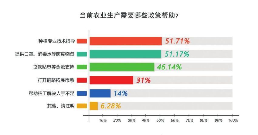 加強農(nóng)技指導,給予金融支持。問卷調查中農(nóng)戶提出多項政策需求,51.71%的農(nóng)戶希望得到種植專業(yè)技術指導,51.17%的農(nóng)戶呼吁提供口罩、消毒液等防疫物資,46.14%的農(nóng)戶則希望得到貸款貼息等金融扶持。(見圖4)