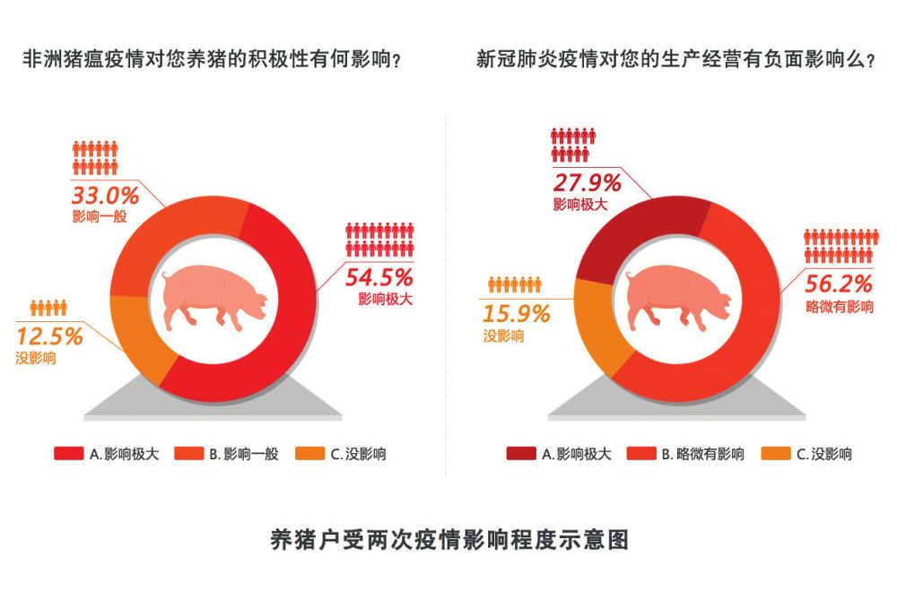調(diào)查顯示,54.5%的養(yǎng)豬戶認為非洲豬瘟疫情對養(yǎng)豬的積極性影響極大,防護成本高、造成虧損、仔豬成本高,是養(yǎng)豬戶反映非洲豬瘟疫情帶來的最強烈影響,27.9%的養(yǎng)豬戶認為新冠肺炎疫情對生產(chǎn)經(jīng)營的負面影響極大。(見圖1)