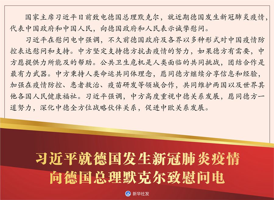 習(xí)近平在慰問電中強(qiáng)調(diào),不久前德國(guó)政府及各界以多種形式對(duì)中國(guó)疫情防控表達(dá)慰問和支持。中方堅(jiān)定支持德方抗擊疫情的努力,如果德方有需要,中方愿提供力所能及的幫助。公共衛(wèi)生危機(jī)是人類面臨的共同挑戰(zhàn),團(tuán)結(jié)合作是最有力武器。中方秉持人類命運(yùn)共同體理念,愿同德方繼續(xù)分享信息和經(jīng)驗(yàn),加強(qiáng)在疫情防控、患者救治、疫苗研發(fā)等領(lǐng)域合作,共同維護(hù)兩國(guó)以及世界其他各國(guó)人民健康福祉。習(xí)近平強(qiáng)調(diào),中方高度重視中德關(guān)系發(fā)展,愿同德方一道努力,深化中德全方位戰(zhàn)略伙伴關(guān)系,促進(jìn)中歐關(guān)系發(fā)展。