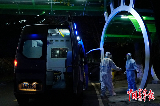 一位發(fā)熱病人被救護(hù)車送進(jìn)金銀潭醫(yī)院,司機(jī)對隨行人員進(jìn)行消殺。