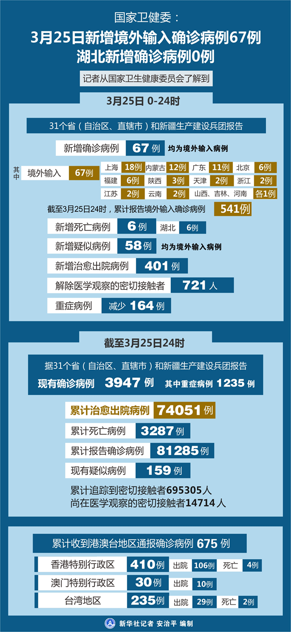 新華社北京3月26日電(記者熊豐、申鋮)記者26日從國家衛(wèi)生健康委員會了解到,3月25日0—24時,31個?。ㄗ灾螀^(qū)、直轄市)和新疆生產(chǎn)建設兵團報告新增確診病例67例,均為境外輸入病例;新增死亡病例6例;新增疑似病例58例,均為境外輸入病例。