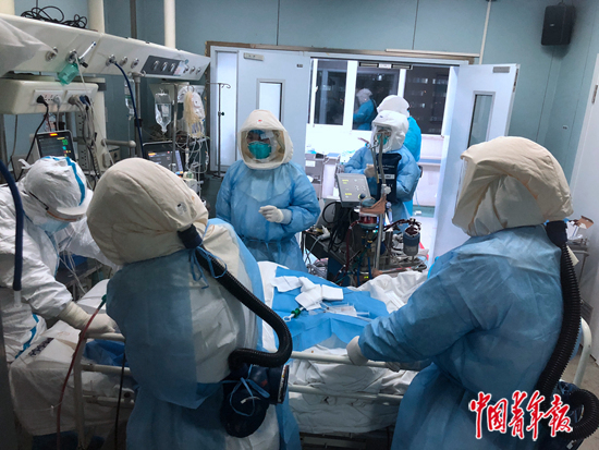 3月9日,在金銀潭南樓的重癥ICU病房?jī)?nèi),醫(yī)護(hù)人員正在對(duì)一名呼吸困難的新冠肺炎患者進(jìn)行纖支鏡手術(shù)。