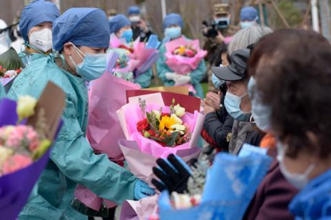 醫(yī)護(hù)人員祝?;颊叱鲈?。范顯海/攝