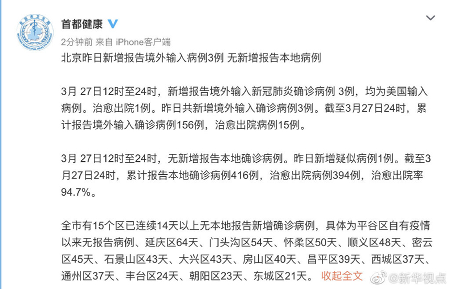3月27日12時至24時,新增報(bào)告境外輸入新冠肺炎確診病例3例,均為美國輸入病例。治愈出院1例。昨日共新增境外輸入確診病例3例。截至3月27日24時,累計(jì)報(bào)告境外輸入確診病例156例,治愈出院病例15例。