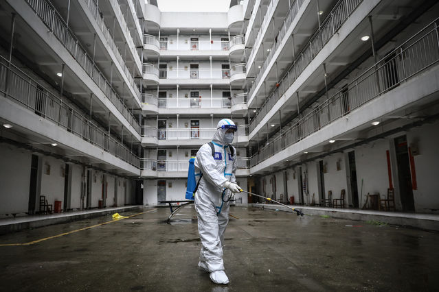 3月27日,武漢軟件工程職業(yè)學(xué)院康復(fù)驛站,工作人員在進(jìn)行消殺。中青報·中青網(wǎng)記者 趙迪/攝