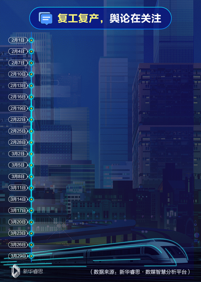 伴隨著復工復產(chǎn)步伐加大,相關(guān)話題在網(wǎng)上的信息量出現(xiàn)激增,關(guān)注熱度也明顯呈現(xiàn)出同步快速增長的趨勢。