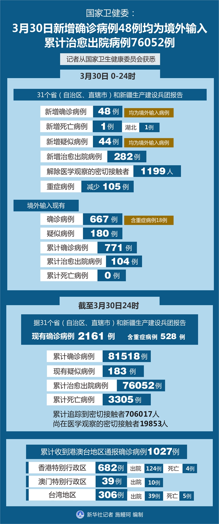截至3月30日24時,據(jù)31個省(自治區(qū)、直轄市)和新疆生產(chǎn)建設(shè)兵團(tuán)報告,現(xiàn)有確診病例2161例(含重癥病例528例),現(xiàn)有疑似病例183例。累計確診病例81518例,累計治愈出院病例76052例,累計死亡病例3305例,累計追蹤到密切接觸者706017人,尚在醫(yī)學(xué)觀察的密切接觸者19853人。