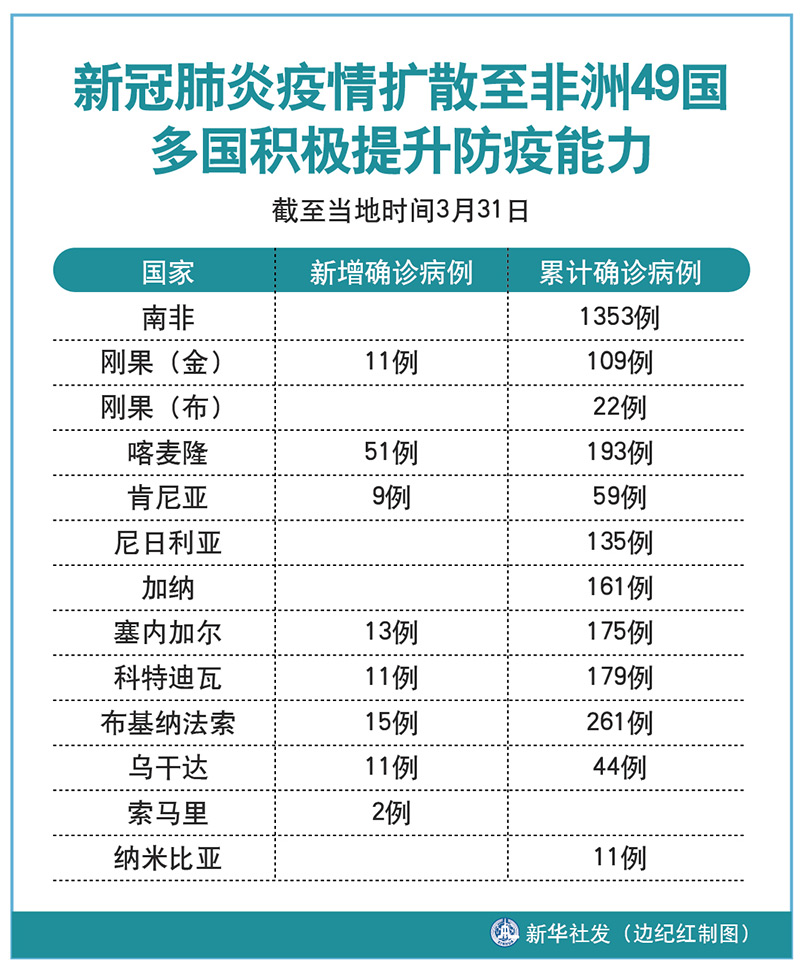截至31日,剛果(金)新增確診病例11例,累計109例;剛果(布)累計22例;喀麥隆新增51例,累計193例;肯尼亞新增9例,累計59例;尼日利亞累計135例;加納累計161例;塞內(nèi)加爾新增13例,累計175例;科特迪瓦新增11例,累計179例;布基納法索新增15例,累計261例;烏干達(dá)新增11例,累計44例;索馬里新增2例;納米比亞累計11例。