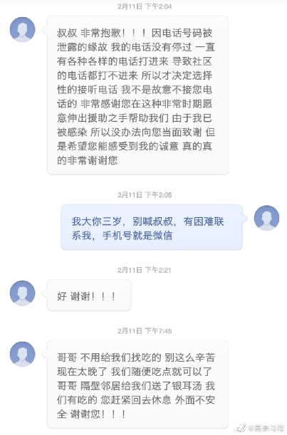 后來,老人每天打電話給所有跟他聯(lián)系過的志愿者,說需要什么物資。而當(dāng)他們定期回訪其他求助者時(shí),大部分人都會說,不需要幫助了,謝謝你們。樓威辰漸漸覺得老人自私貪婪,就不再接電話了。