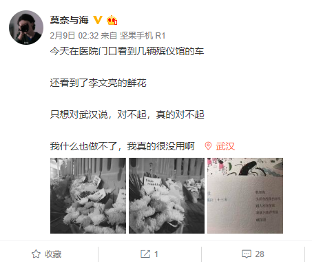 2月8日,他送一個(gè)紅會志愿者去武漢市中心醫(yī)院,給李文亮醫(yī)生獻(xiàn)花。他在醫(yī)院門口看到幾輛殯儀館的車,門診大門前堆滿了花束,連院外圍欄也放了一排鮮花在地上,每束花都有一個(gè)小紙條,寄托著同一種情緒。