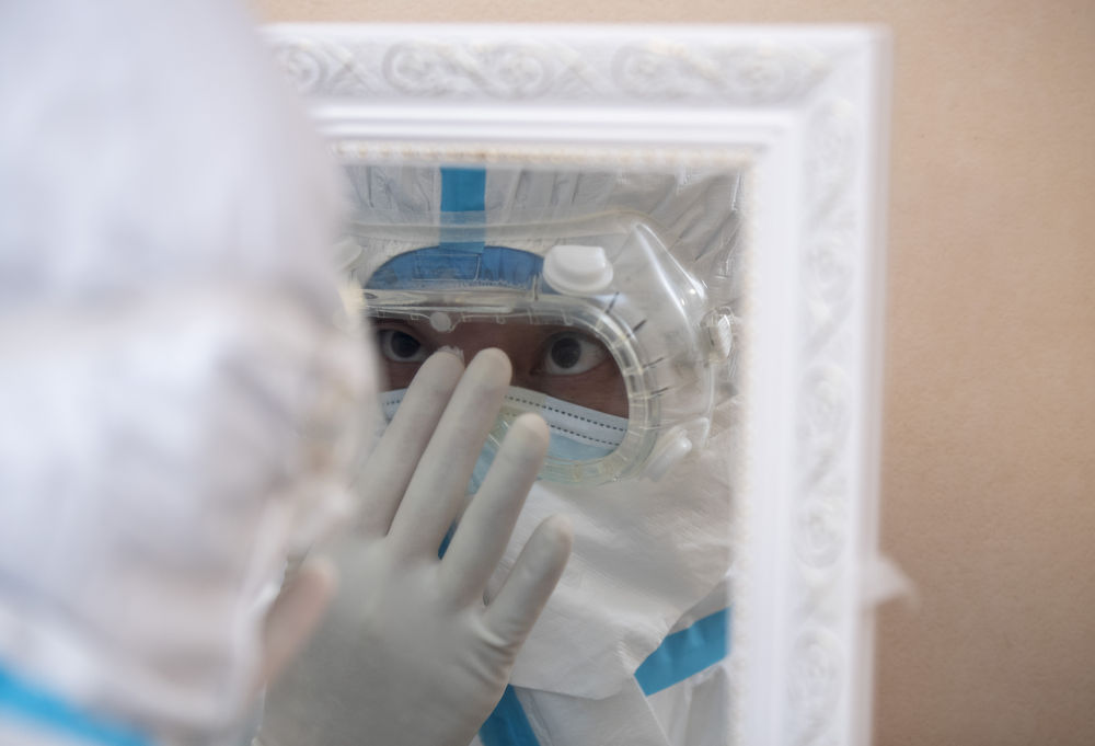 ↑3月13日晚,“擺渡人”小分隊(duì)隊(duì)員楊暉檢查護(hù)目鏡的佩戴情況。隊(duì)員的防護(hù)措施同重癥病房的醫(yī)生一樣,完成所有防護(hù)措施要經(jīng)過(guò)12個(gè)步驟。在華中科技大學(xué)同濟(jì)醫(yī)學(xué)院附屬同濟(jì)醫(yī)院光谷院區(qū),有很多生命“擺渡人”。“擺渡人”日夜在醫(yī)院與醫(yī)院之間,留觀點(diǎn)與醫(yī)院之間穿梭不停,轉(zhuǎn)運(yùn)新冠肺炎患者。