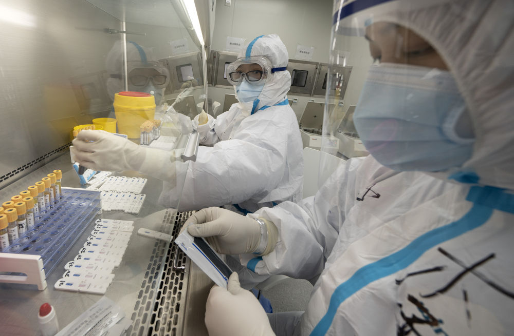 ↑3月4日,在武漢雷神山醫(yī)院醫(yī)學(xué)檢驗(yàn)科,工作人員在對(duì)患者的血液樣本進(jìn)行檢測(cè)。
