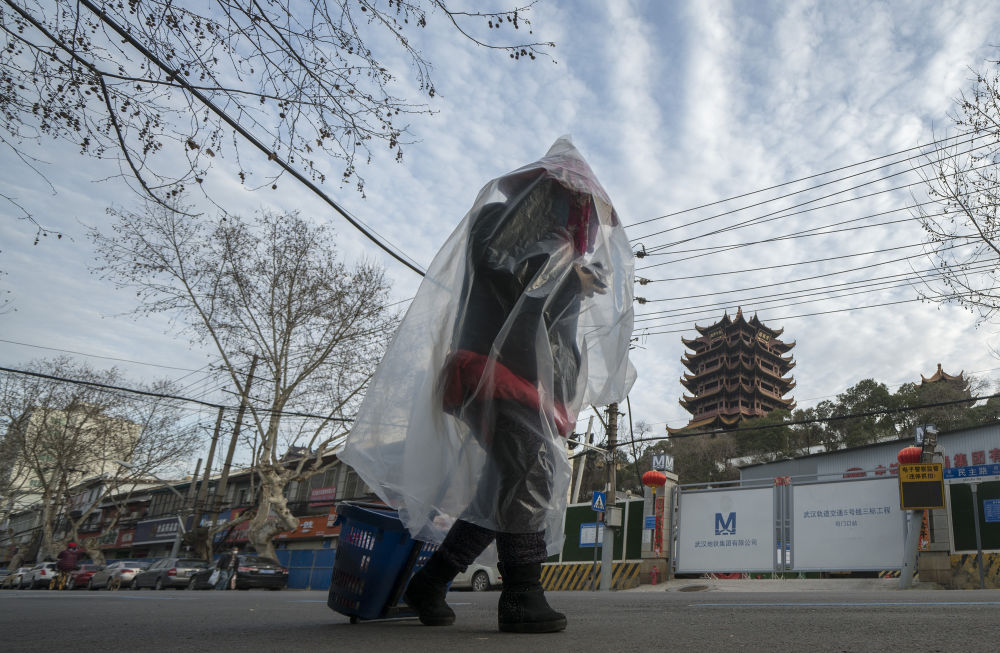 ↑3月15日,一位身穿自制“防護(hù)服”的女士上街買(mǎi)菜時(shí)從黃鶴樓下走過(guò)。她說(shuō)她近兩個(gè)月來(lái),只出過(guò)兩次門(mén)。