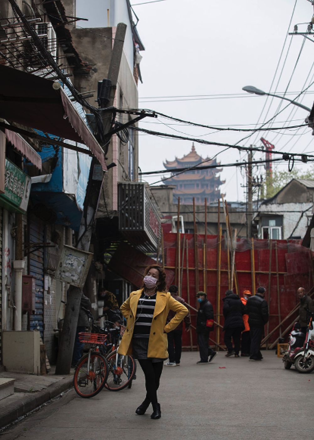 ↑4月2日,在武漢黃鶴樓附近的武漢西城壕社區(qū),一位女士在練習(xí)模特步。
