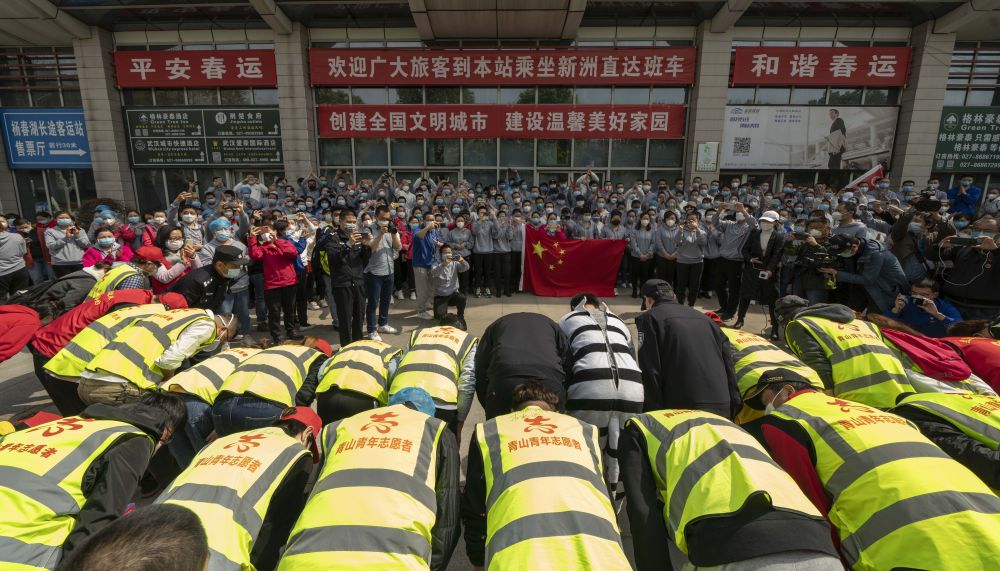 ↑3月19日,在河南醫(yī)療隊(duì)駐地,工作人員、志愿者和酒店職工鞠躬感謝即將踏上歸程的河南醫(yī)療隊(duì)成員。