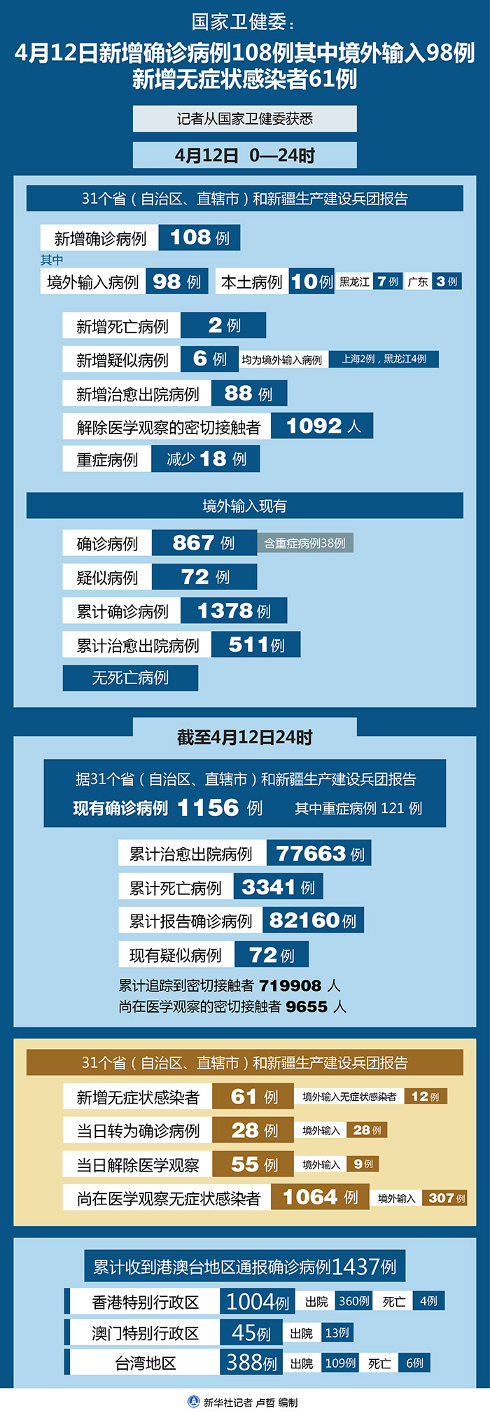 截至4月12日24時(shí),據(jù)31個(gè)?。ㄗ灾螀^(qū)、直轄市)和新疆生產(chǎn)建設(shè)兵團(tuán)報(bào)告,現(xiàn)有確診病例1156例(其中重癥病例121例),累計(jì)治愈出院病例77663例,累計(jì)死亡病例3341例,累計(jì)報(bào)告確診病例82160例,現(xiàn)有疑似病例72例。累計(jì)追蹤到密切接觸者719908人,尚在醫(yī)學(xué)觀察的密切接觸者9655人。