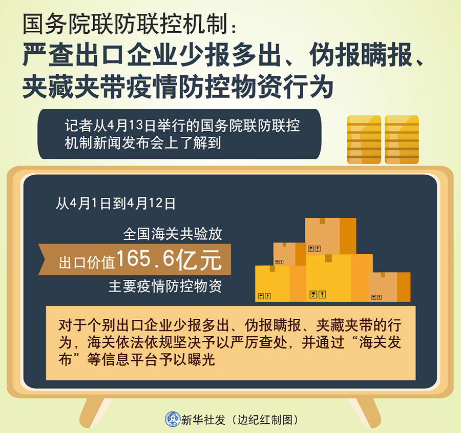 新華社北京4月13日電(記者屈婷、王鵬)記者從13日舉行的國務(wù)院聯(lián)防聯(lián)控機(jī)制新聞發(fā)布會(huì)上了解到,從4月1日到4月12日,全國海關(guān)共驗(yàn)放出口價(jià)值165.6億元的主要疫情防控物資,對(duì)個(gè)別出口企業(yè)少報(bào)多出、偽報(bào)瞞報(bào)、夾藏夾帶的行為,依法依規(guī)予以嚴(yán)厲查處。
